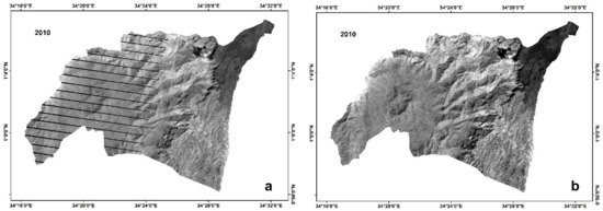 A view of the scan line corrector (SLC) failure of Landsat 7 image acquired in 2010: (a) SLC-Off and (b) SLC-Off correction.