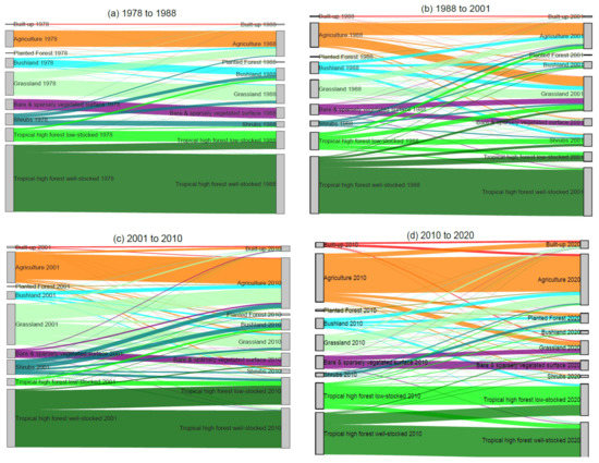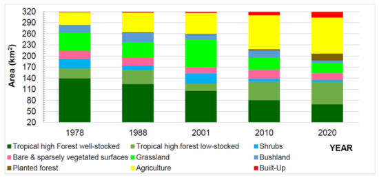 After 1978, land cover changes were visible in 1988, 2001, 2010, and 2020 across all the land cover types, as shown in Figure 5. It is worth noting that the percentage change from 1978 to 2020 was as follows: planted forest (3966%), built-up (890%), agriculture (186%), tropical high forest low-stocked (119%). Furthermore, the negative percentage change was recorded by shrubs (−81%), bushland (−68%), tropical high forest well-stocked (−50%), grassland (−44%), and bare and sparsely vegetated surfaces (−14%) in the period of 1978–2020.