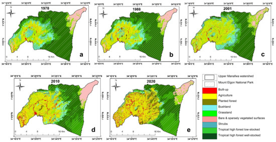 The classified land cover maps for 1978 (a), 1988 (b), 2001 (c), 2010 (d), and 2020 (e) of upper Manafwa watershed.