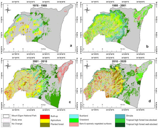 The trend of land cover change from 1978 to 2020 in the upper Manafwa watershed highlights the influence of socioeconomic forces on natural land cover conversion. According to previous studies, forest cover on Mount Elgon in general experienced widespread encroachment and deforestation between the 1980s and early 2000s owing to population pressure, political instability, and laxity in the implementation of environmental policies [46,68,77]. Although there were efforts toward curbing deforestation and encroachment, a large stance of tropical high forest well-stocked cover was hence lost into tropical high forest low-stocked, shrubs, bushland, and agricultural land [8,37]. These land cover out-flows arose especially in areas where the community members frequented the park (illegally) to access firewood, bamboo shoots (maleewa), medicinal plants, and other forest products [36,37,78]. Over time, the continued access and illegal extraction of some park resources led to the decline in forest cover and, therefore, accelerated land cover changes in the park area [40,46].