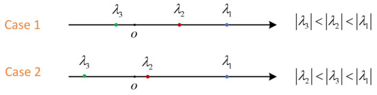 In our problem, the eigenvalue must be real because are Hermitian matrices. The boundary points on the BCR correspond to the largest and smallest eigenvalues. However, the power methods can only obtain the largest and least eigenvalues in amplitude. As the eigenvalues are sorted differently, the eigenvectors are not always identical. Figure 3 illustrates two cases in eigenvalue sorting. In the first case, the eigendecomposition and the power methods get the same eigenpairs. However, in Case 2, they are different. To solve this problem, we use a theorem as follows