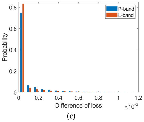 The absoulte difference of loss function between TSIA + IEBCR + ILUT and TSIA + IEBCR + LUT. (a) P-band. (b). L-band. (c). The distribution of the absoulte error.