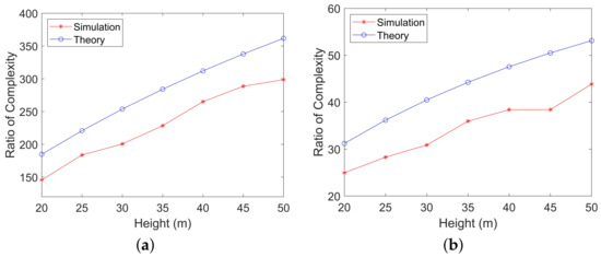 Comparison of the ratio of complexity between theoretical analysis and simulation. (a) First experimental configuration. (b) Second experimental configuration.