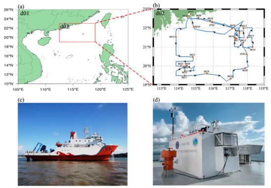 (a) the region of interest; (b) the cruise of Shen Kuo during June and July 2019; (c) the Shen Kuo research vessel; (d) the atmospheric optical comprehensive observation shelter on board.