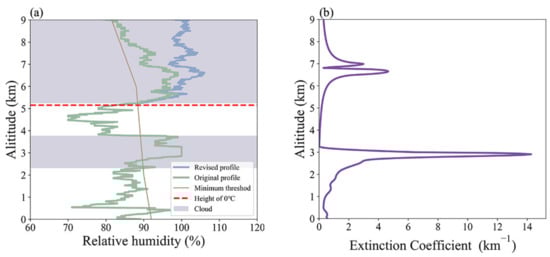 (a) Relative humidity profile at 00:04 28 June 2019 (BJT). The green line represents the original profile, while the blue line represents the revised profile. The red dotted line represents the height of 0 °C, and the brown line indicates the minimum humidity threshold. The purple areas represent the height at which the clouds appear; (b) the extinction coefficient profile at 00:02 28 June 2019 (BJT).