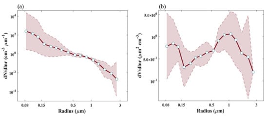 where and represent the wet diameter and dry diameter of particles, respectively, and RH represents the relative humidity. It is proven that the formula still has high accuracy under the condition of high humidity []. According to the above formula, the observed aerosol particle size under the condition of environmental humidity is adjusted to the dry particle size. Finally, the radius range of dry particles is 0.08~3.12 .