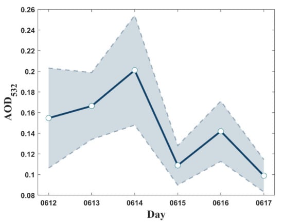Daily variations in AOD532 from 12 to 17 June 2019. Blue hollow dots represent the daily average AOD532, and the shadow represents the standard deviation.