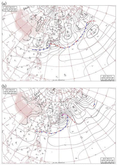 Weather maps containing meteorological observation records can depict the synoptic condition of the relevant region and are extremely valuable in understanding the regional weather evolution process. Japan Meteorological Agency has gathered a wealth of excellent ground observation data and created weather maps with the assistance of its well-equipped meteorological observation system (http://www.data.jma.go.jp/fcd/yoho/wxchart/quickmonthly.html (accessed on 5 September 2021)). The National Institute of Informatics of Japan (NII) visualizes the original weather maps provided by the Japan Meteorological Agency to make them clearer and more intuitive and finally forms its own weather map database (http://agora.ex.nii.ac.jp/cgi-bin/weather-chart/calendar.pl?lang=ja (accessed on 5 September 2021)). This meteorological map database has a long time span, ranging from 1883 to now. Daily data contain four observations, occurring at 00:00, 06:00, 12:00, and 18:00 (UTC), respectively. In addition, the product is divided into 5 layers: surface, 850 hPa, 700 hPa, 500 hPa, and 300 hPa. Its geographical scope can be expanded from Japan to the Asia Pacific region and even the whole northern hemisphere. In this work, we employ the surface weather map from 12 June to 17 June 2019 to analyze the weather conditions during the experiment.