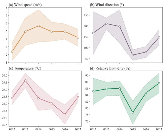 Daily variations in meteorological elements during the period from 12 to 17 June 2019: (a) wind sped (m/s); (b) wind direction (°); (c) temperature (°C); (d) relative humidity (%). In addition, hollow dots represent the average values, while the shadows indicate the standard deviations.