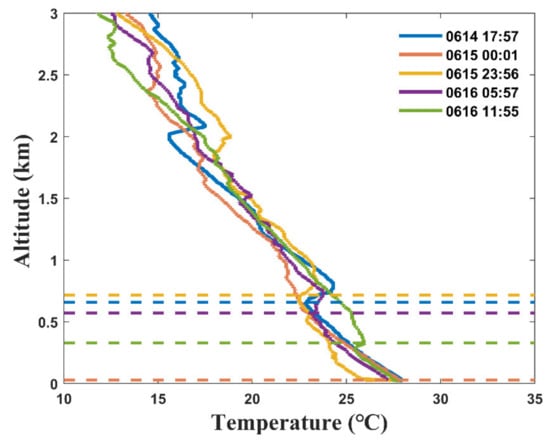 Temperature profile measured at 5 times (BJT): 17:57 14 June 2019 (blue), 00:01 15 June 2019 (red), 23:56 15 June 2019 (yellow), 05:57 16 June 2019 (purple), 11:55 16 June 2019 (green). The dotted lines are the bottom heights of the inversion layer at the corresponding time.