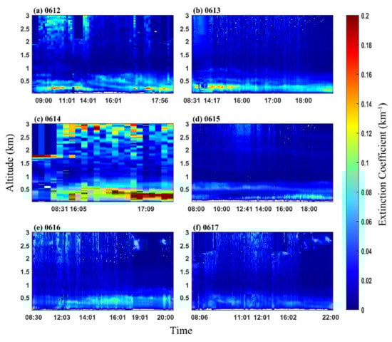 The cross sections of the extinction coefficient from 12 June to 17 June 2019.