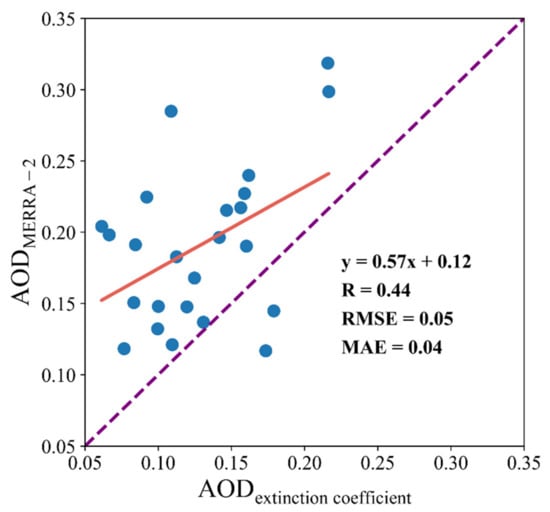 Scatter plot of MERRA-2 and the observations of AOD at 550 and 532 nm, respectively, during the voyage from 8 June to 2 July 2019. The purplish dotted line represents the 1:1 line. The red line represents the fitting curve. The correlations coefficient (R), the root mean square error (RMSE), and the mean absolute error (MAE) are indicated in the figure.