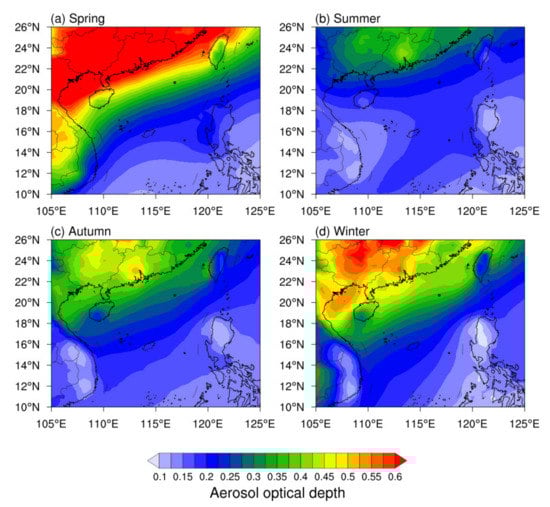 Given the monsoon climate over the study region, it is of great value to clarify the spatial distributions in different seasons, as depicted in Figure 13. Here, four seasons are classified as followed: (1) spring (March, April and May); (2) summer (June, July and August); (3) autumn (September, October and November); (4) winter (December, January and February). Compared to other seasons, the AOD over the coastal area is exceedingly higher in spring, even exceeding 0.6 in some areas. It may be associated with the high intensity of biomass burning, such as forest fires or agricultural crop burning []. In contrast to spring, AOD in summer shows an obvious low value. Most AOD values in summer are below 0.25, mainly due to the southwest monsoon and the frequent rainfall settlement. The transport of pollutants from the continent to the ocean rises as the winter monsoon increases, resulting in an increase in AOD during the winter over the ocean.