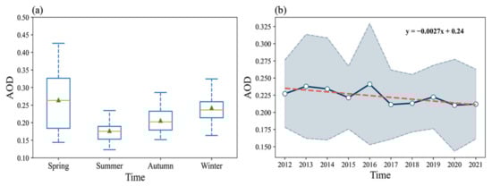 The statistical results of the seasonal average AOD are shown in Figure 14a. The AOD in spring ranks the highest with a median of 0.26, followed by winter, autumn, and summer with their AOD of 0.24, 0.20, and 0.18, respectively. The characteristics of high AOD in spring and winter as well as low AOD in summer and autumn are intuitive, which is consistent with the seasonal variations observed by Wang et al. [].