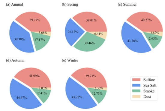 To further understand the variations in AOD over the study region, it is critical to focus on the contributions of various aerosol compositions. In MERRA-2 aerosol products, five components are classified: sea salt, sulfate, black carbon, organic carbon, and dust, respectively. Here, black carbon and organic carbon are combined into one category of smoke. Annual and seasonal mean proportions of these components in AOD are illustrated in Figure 15. In terms of the annual contribution, sulfate and sea salt play a control role in AOD, with high ratios of 39.77% and 39.38%, respectively. Smoke accounts for 17.17%. The proportion of sand dust is the lowest, only 3.68%. The seasonal proportions of each component differ little from the annual average, except in spring. Compared with other seasons, the percentage of smoke in spring increased significantly, reaching 30.46%. The combined contributions of smoke and sulfate compositions bear responsibility for about 70% of the total AOD in spring. In addition, the ratio of dust AOD in spring reaches the maximum value, which is almost twice the annual average. It may be linked to the long-distance transport of dust aerosols from the Sahara and the deserts of northwest China []. The occurrence of these high proportions of components may be the reason for the high AOD in the spring mentioned above.