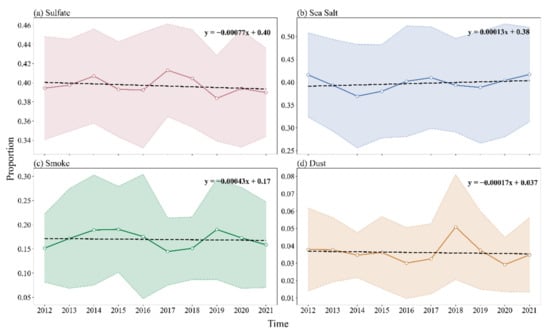The fraction change in four components in the last ten years is exhibited in Figure 16. From 2012 to 2021, the mean contribution rate of smoke to AOD is maintained at around 0.17. The values of dust AOD range from 0.03 to 0.05 during the study period. Different from sulfate, smoke, and dust, the relative contribution of sea salt seems to increase year by year, but these four trends are not obvious. However, the contribution rates of sulfate and smoke show negative trends of −0.00077 year−1 and −0.00043 year−1, respectively, which indicates that the aerosol in the sea is reduced to a certain extent due to human activities. It should be noted that the component of nitrate is not involved in the MERRA-2 aerosol product. Tao et al. [] discovered that turbulent mixing of residual aerosols, produced from low-level shallow stratocumulus clouds evaporating, contributes to the enhancement of nitrate mass concentrations. This suggests that MERRA-2 reanalysis still needs to be further improved.
