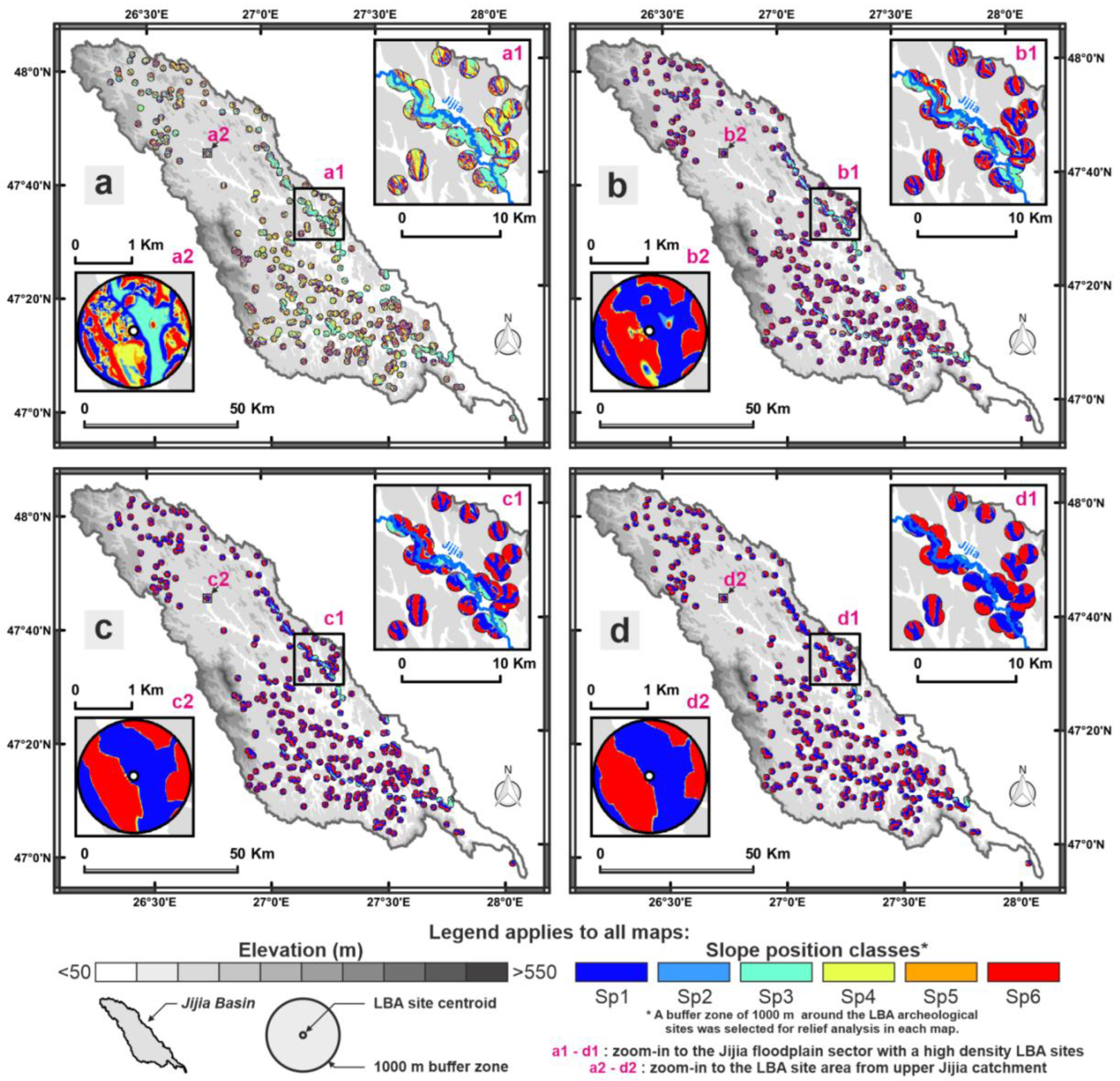 - According to the slope position classification (first method) resulting from R = 300 m of TPI-based DEV and LiDAR-derived slope combination, over 38% of LBA settlements were placed on the concave landforms (Sp1—valleys and Sp2—lower slope); 7.45% of LBA sites were located on the Sp3—flat areas (≤5°); and over 54% of LBA settlements were placed on the convex landforms (Sp4—middle slope, Sp5—upper slope and Sp6—ridges, tops of the hills).