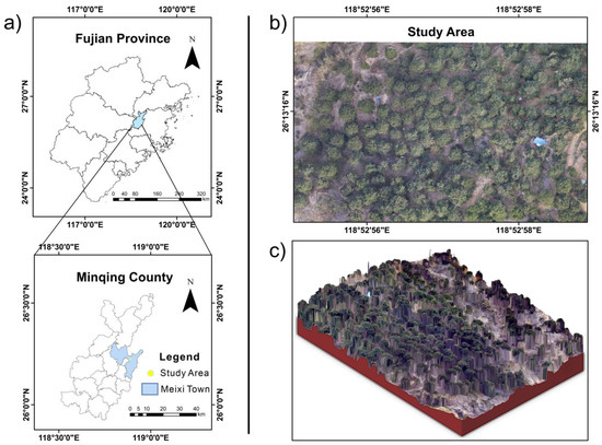 Geographic location of study area: (a) administrative map; (b) DOM; (c) 3D model.