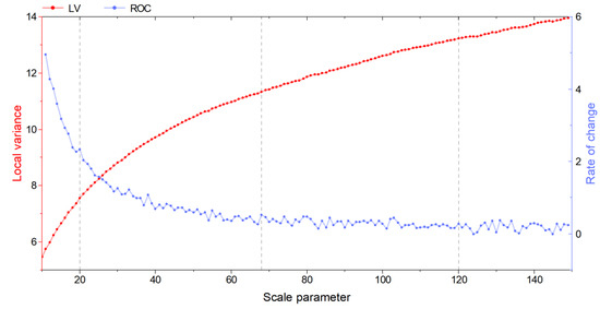 We used the ESP2 plug-in in eCognition Developer 9.0 software (Trimble Germany GmbH, Munich, Germany) [39] to select the optimal segmentation scale for the image and set the weight of each layer to 1. The spectral information of the image is dominant in the RS image and influence of the shape factor parameter is largely controlled by segmentation quality. Therefore, the weight of the spectral information should be given priority when assigning the weight of the spectrum and shape factor. By setting different parameters for multiple testing, we set the weight of the shape factor (shape) and spectral factor (spectrum) to 0.1 and 0.5, respectively. The optimal scale was extracted according to the LV and ROC values under different scale parameters. Figure 2 shows that the LV increases, and ROC decreases with the increase of segmentation scale. To obtain the critical value between over- and under-segmentation of the image, the scale when the ROC curve peaks was selected as the better one. Since there were multiple values for the optimal scale, we took several potential optimal scales such as 20, 38, 55, 68, 86, and 120 when the ROC was at its peak, to segment the image layers.