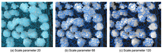 For the RS images of the study area, we selected several of the above scales when the ROC was at the peak as the scale parameters for segmentation. Figure 3 shows the effects of over-segmentation, optimal segmentation, and under-segmentation scale appearing in the study area. Because of the complexity of ground objects in the study area, the phenomenon of under-segmentation was obvious when the segmentation scale was large. Different types of ground objects were included in the same object, resulting in confusion among the segmentation objects, and the COTC could not be effectively segmented from imagery (Figure 3a). If the segmentation scale is too small, it will be over-segmented, and the segmentation between continuous objects of the same type will be too fragmented (Figure 3c); this will affect the classification accuracy and model training time. After visual interpretation, when the segmentation scale was 68, there was a relatively satisfactory boundary between the tree crown and other ground object categories, and there were fewer objects that were too fragmented in the single tree crown layer (see Figure 3b); thus, the segmentation effect was better. Therefore, we selected 68 as the segmentation scale.
