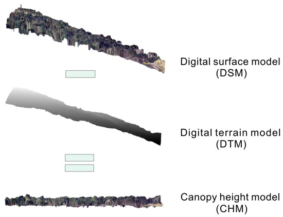 Tree height is an important parameter of single tree structure. With the development of computer vision technology, it is possible to extract single tree structural parameters (tree height) using UAVs. The canopy height model (CHM), which can eliminate the effect of terrain relief on the elevation of ground objects in DSM images, has been widely used to quantify tree heights in UAV images [40]. Here, we used ArcGIS 10.5 software (ESRI Inc., Redlands, CA, USA) to extract the CHM from DSM data. First, we manually identified non-COTC areas in the DSM imagery by visual inspection and created point features. Simultaneously, we imported the elevation values of non-COTC areas into point feature fields. Second, spatial interpolation methods such as inverse distance weighted interpolation, kriging interpolation, natural neighbor, and spline interpolation were used to spatially interpolate the ground point data. In addition, the kriging interpolation method with a better effect was screened through visual interpretation to generate digital terrain models (DTMs). DSM is a model that includes the heights of trees and other objects, reflecting the real surface conditions, whereas the DTM only represents the fluctuation of the terrain without including the elevation values of surface objects. Therefore, the CHM can be generated by performing a difference operation between DSM and DTM (Figure 4).