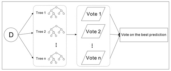 RF is a classifier that integrates multiple decision trees for prediction; Figure 5 shows a conceptual diagram of the RF model. It uses bagging to vote on classification results of several weak classifiers and uses the category with the most votes as the final output to form a strong classifier. It has the advantages of high accuracy, running on large datasets, processing samples with high-dimensional features, and good robustness when dealing with noisy data [57]. The two most important parameters in the RF model include the number of features contained in each tree node (Mtry) and number of decision trees (Ntree), which together determine the classification effect of the model. RF uses a bootstrap sample when constructing each tree, and approximately 1/3 of the samples of each tree do not participate in the training of the model. Such samples are called out-of-bag (OOB) and can be used to calculate feature importance and selection, as well as participate in internal cross-validation to assess the performance of the RF model. The errors generated by these samples are called OOB error rates [58].