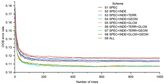 Here, we constructed the changes in OOB-error when Ntree is from 1 to 1000 under nine different feature combination schemes (see Figure 6). Due to the robustness of the RF model and absence of overfitting, Ntree could be set as large as possible. Considering the computational efficiency of the RF model, we set Ntree to 400 for all schemes according to the OOB error-Ntree curve because beyond this value the OOB error was insensitive to changes in Ntree. Since RF needs to calculate the information gain of all feature contributions of each decision tree node [58], to ensure calculation efficiency, we set Mtry as the square root of the number of input features.