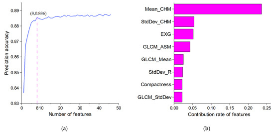 To determine the optimal number of features in the RF model, we used recursive feature elimination (RFE) for feature optimization. First, we input all features in the object as initial features into the classifier and used the OOB samples generated by the RF model for cross-validation to obtain the prediction accuracy of the classifier in this feature combination; then, the importance of each feature was obtained [59]. Second, the feature with the lowest feature importance is removed from the original feature set each time, and the new feature subset is input to the classifier. Through the continuous loop iteration of the above method, the prediction accuracy of 46 sets of feature subsets was obtained (Figure 7a). The figure shows that the prediction accuracy increased rapidly with the input of features with higher importance scores, and the local maximum point of the prediction accuracy appeared when the number of features was eight. Subsequently, the prediction accuracy decreased with an increase in the number of features until the input of the 13th feature started to increase slowly. To improve the classification efficiency, we selected as few feature subsets as possible as the optimal feature combination to participate in the training of the model under the premise of ensuring prediction accuracy. Based on the feature importance ranking (Figure 7b), we retained a total of eight feature indices, including Mean_CHM, StdDev_CHM, EXG, GLCM_ASM, GLCM_Mean, StdDev_R, Compactness, and GLCM_StdDev. The above indices cover five categories of features: spectrum, vegetation index, shape, texture, and terrain.