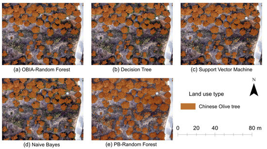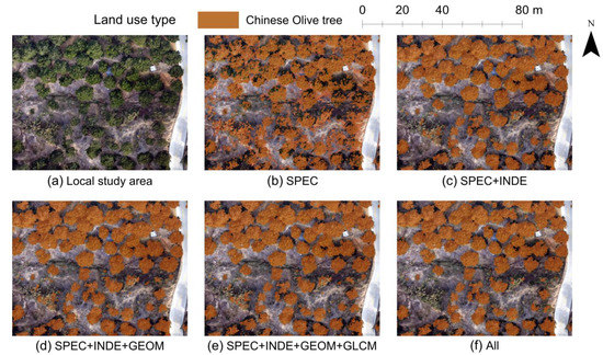 The binary classification extraction results of COTC with different feature dimension schemes based on OBIA-RF are shown (Figure 8). The RGB true color composite image of the local image in the study area is shown (Figure 8a). The training samples were extracted using only spectral features (Figure 8b). There were serious misclassifications and omissions in the picture, and many herbaceous plants were incorrectly classified as Chinese olive trees. This may be because the color of herbaceous plants was greenish, and the spectral features were close to those of the COTC. Simultaneously, some darker areas in the COTC were missed in the classification because of the influence of the incident angle of sunlight and shading of leaves. Vegetation index features were added based on spectral features, as Figure 8c shows, and the extraction effect was greatly improved. However, because the visible band had fewer vegetation indices than multispectral sensors with near-infrared band, the COTC was easily misclassified into other vegetation types with similar spectral features, such as single-growing shrubs. Therefore, we successively introduced geometric and textural features (Figure 8d,e). The extraction results were less different, and the addition of textural and geometric features could improve the accuracy of identifying non-COTC shadow areas. However, it was difficult to improve the misclassification phenomenon between different vegetation types. After adding terrain features, the extraction results of the scheme based on all features are shown (Figure 8f). In comparison with previous schemes, the misclassification of different vegetation types and omission of crown contours and shadow areas were improved. Based on visual assessment and the verification results of the test points, it was concluded that the extraction results of this scheme were the closest to the actual situation in the study area.