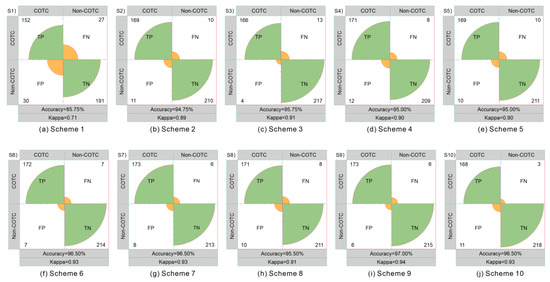 To quantitatively describe the extraction accuracy of the RF algorithm in the OBIA method for dealing with the binary classification problem, we calculated the quantitative evaluation indicators (UA and PA of the target object type, and OA and Kappa of the overall classification result). Simultaneously, we divided the extraction results of the image objects where the accuracy verification points were located into true positive (TP), false positive (FP), true negative (TN), and false negative (FN) (the sum of the above four points was the total number of accuracy verification points). The COTC extraction results were analyzed using a RF algorithm based on different and optimal feature combinations (Figure 9).