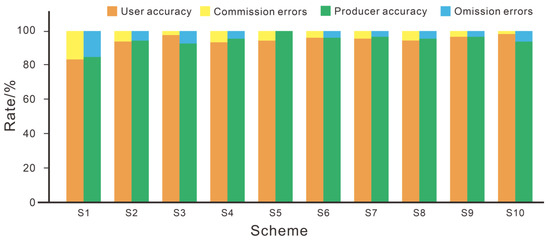 From the numerical relationship, in all schemes, the overall accuracy was between 85.75% and 97%, and the Kappa coefficient was between 0.71 and 0.94. This showed that the combination of the OBIA and RF algorithms could obtain high accuracy in the binary classification of HR images. Among all schemes, S1 only used spectral features of the image to extract target objects, and the overall accuracy and Kappa coefficient were the lowest at 85.75% and 0.71, respectively. The extraction accuracy was significantly improved after the vegetation index feature was added to S2, and the overall accuracy and Kappa coefficient increased by 9% and 0.18, respectively; this indicates that the vegetation index was effective in the extraction of COTC, and the increase in the feature dimensionality had a positive effect on extraction accuracy. To clarify the influence of feature dimensionality on extraction accuracy, terrain, geometric, and textural features were added to the S3–S5 schemes, respectively, and all three schemes improved their extraction accuracy. Among them, terrain features had the greatest improvement in OA and Kappa, whereas geometric and textural features had similar contribution rates to extraction accuracy and were both less than terrain features. Therefore, the extraction accuracy was not only related to the number of features, but to the contribution rate of different feature types to the extraction accuracy of target ground objects. To prove the above conclusion, the three features of terrain, geometry, and texture were combined in pairs, and the spectral and vegetation index features were added to construct schemes S6–S8; in comparison with the first five schemes S1–S5, the accuracy of the three schemes was improved. The classification accuracy of scheme S8 was higher than that of S4 and S5 after introducing geometric and textural features, but less than that of schemes S6 and S7 with terrain features. It could be seen that the extraction accuracy of COTC generally increased with the increase of number of features, but it was related to the contribution rate of different feature types to the extraction accuracy. To obtain the highest accuracy, all feature categories that have a positive contribution to the extraction accuracy were used to construct scheme S9; through the accuracy evaluation, the OA and Kappa were 97.00% and 0.94, respectively, and the extraction accuracy was the highest among all schemes, which proved the above conclusion. Among all features with positive contribution rates, redundant features contributed less to the extraction accuracy. Therefore, we constructed scheme S10 by extracting the top eight features with the highest importance after dimensionality reduction of all features. The OA and Kappa of S10 were 96.50% and 0.93, respectively, which were only 0.50% and 0.01 different from those obtained using all 46 features, and the classification accuracy using the optimized features reached 99% of the accuracy achieved using all features. The above conclusions show that it was not necessary to extract all features of the target ground objects when participating in the model training. Simultaneously, it indicated that the RF algorithm could not only deal with high-dimensional features but showed good performance in lower-dimensional features.