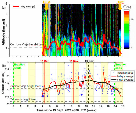 Figure 2 shows the time-height plot of the volume depolarization ratio, , and the temporal evolution of the peak height, , of the lowermost volcanic plume. Weekly mean values of are given in Table 1. The color code in Figure 2a was adjusted so that black is representative of the molecular level. For the time–height plot, was preferred against because of its physical meaning even in a molecular atmosphere and a higher signal-to-noise ratio. Luckily, very few mineral dust intrusions occurred during the period under study. Two were clearly identified as such: one between 19 October 00 UTC and 22 October 11 UTC (first marked dust event in the figure) and another one after the end of the eruption (second marked dust event in the figure). The 1-day average of the peak height of the lowermost volcanic plume did not exceed 3 km, and lofted layers (>3 km) were relatively seldom.