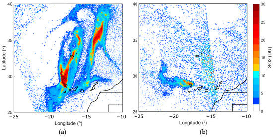 TROPOMI sulfur dioxide total vertical column (DU) over the Canary Islands on (a) 18 October and (b) 15 November 2021. Overpass time is about 13:30 local time.