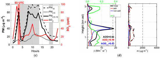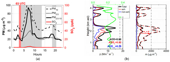 Several volcanic layers were observed on the profiles of (Figure 4b): the lowermost layer up to 2.5 km and two thinner layers at 3.4 and 4.0 km. The total backscatter coefficient reached extremely large values, as high as 15 Mm−1sr−1. In most of the profiles, was high and varied between 0.2 and 0.3, indicating a strong contribution of the ash vs. non-ash particles in the whole profile. The total, ash and non-ash AOD were 0.80, 0.52, and 0.28, respectively. The ash AOD represented 65% of the total AOD. The non-ash AOD, 0.28, was far from being negligible. This result contrasted strongly with that of the surface SO2, which was close to zero on that day (Figure 4a).