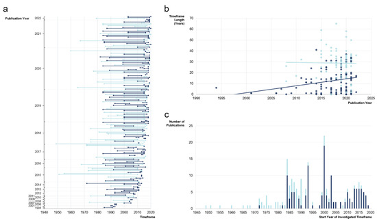 (a) Overview of investigated timeframes in reviewed publications. (b) Development of investigated timeframe lengths over the years. (c) Frequency and distribution of start years of investigated timeframes. Points signify studies, the general trend can be discerned from linearly fitted lines. Studies are color coded to show whether they did or did not consider intra-annual dynamics (dark and light blue, respectively).