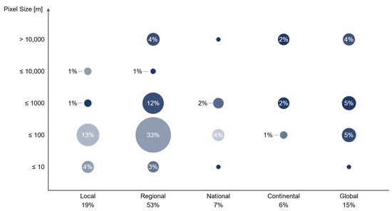 Visualization of spatial resolution versus study area size. Share of all included works is expressed in the area of scatter points and indicated as percentage values for each scatter point. Additionally, color shading from light to dark blue expresses the share of studies within a particular group that consider intra-annual dynamics. The darker the shading, the more studies of this group are considered intra-annual dynamics. For example: 100% of studies have a spatial resolution of ≤1000 m and global coverage analyze intra-annual dynamics, while only 30% of studies have a spatial resolution of ≤100 m and local coverage consider intra-annual dynamics.