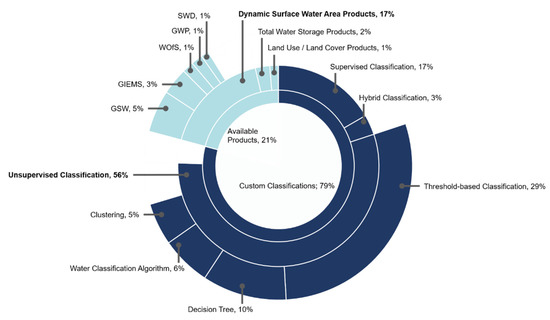 Detailed summary of methods used for the analysis of surface water dynamics. Custom classification approaches and approaches based on available products are shown in dark blue and light blue, respectively. The percentage value represents the share of all included works. All works are sorted as specifically as possible. Methods belonging to multiple subgroups or with too little detail to sort them correctly are not categorized further.