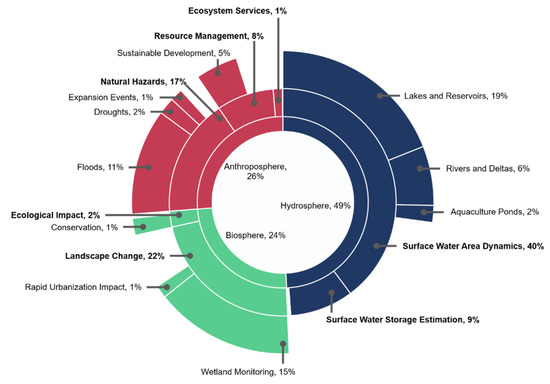 Detailed summary of investigated applications of n = 221 publications. Application fields are color-coded: Hydrosphere – blue, Biosphere – green, Anthroposphere – red. Most works are concerned with several of the given application topics. However, only the main focus is considered for this figure. Due to a rounding error, the numbers do not add up exactly. The closeness of spheres mimics the relatedness of focus topics. Those works that are not specified into further subgroups have a focus too broad to narrow it down further. As an example: 49% of included works have their primary focus on hydrosphere. A subset of 40% of all included works concentrates on surface water area dynamics. Narrowing it down further, a subset of 19% of included publications concentrates on lakes and reservoirs.