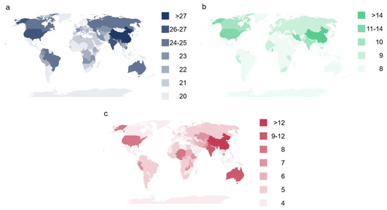 Number of studies mostly concerned with a thematic focus on hydrosphere (a), biosphere (b), and anthroposphere (c).