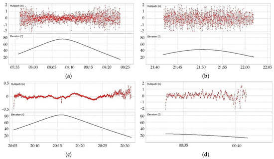 Figure 1. Multipath effects of HY-2D and G03 on DOY 266 in 2021. (a,b) MP1; (c,d) MP2.