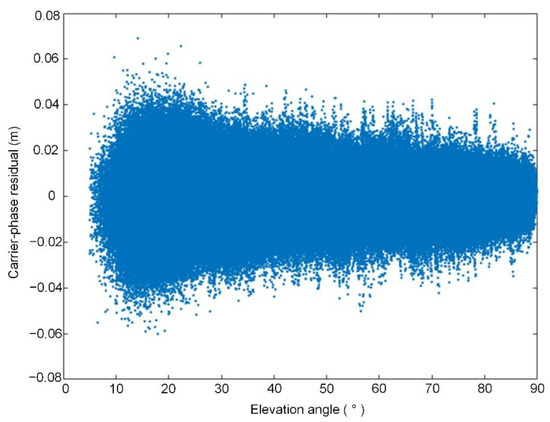 As shown in Figure 2, the RMS of the residuals was 7.8 mm, indicating the high accuracy of the carrier observations of HY-2D. The carrier-phase residuals were large when the elevation angles were less than 20°; the main reason for the phenomenon was that the receiver’s ability to capture the signal was poor when the elevation angles were too low, resulting in poor quality of observations. Therefore, in the process of POD, the low-elevation angle data with poor quality could be deleted by setting the cut-off elevation angle. The cut-off elevation angle set in the process of orbit determination in this study was 5°.