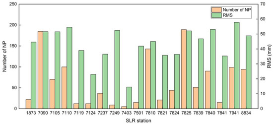 During the experiment, a total of 1407 normal point (NP) data from 19 stations were used to validate the orbits of HY-2D. Due to missing observations from HY-2D at DOY 266, the orbit in this period was calculated by Bernese 5.2 internal interpolation, and the results of POD are not accurate. Therefore, the NP data observed during the missing period needed to be deleted, and a total of 105 NP data were deleted from six stations: 7090, 7810, 7840, 7941, 8834, and 7839. The RMS value of the check and the number of NP data for each station were calculated and are tabulated in Figure 3.