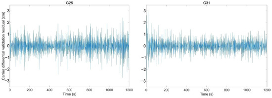 As shown in Figure 4, when using the G05 satellite for the validation, its data were removed from the observations so that they were not used in POD and to ensure that the validation method was an external method. In order to illustrate the reliability of carrier differential validation, experiments were carried out 30 times, with only one set of GPS data removed each time. The results of the validation are shown in Table 7.