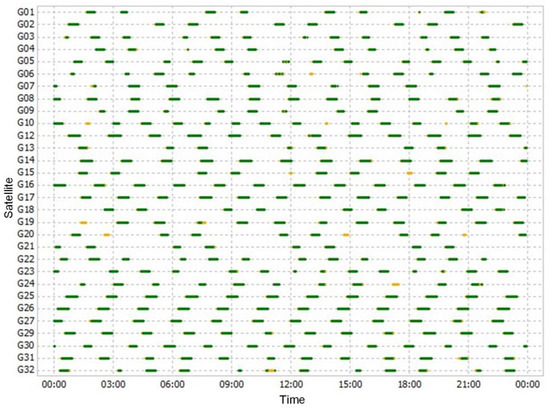 The observations of HY-2D satellite-borne GPS were first processed, and then the data of the satellites involved in the validation were selected according to the distribution of the time series of GPS satellites that were observed. The distribution of GPS satellites observed by the HY2 receiver is shown in Figure 5.
