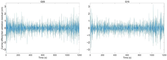 As shown in Figure 4, when using the G05 satellite for the validation, its data were removed from the observations so that they were not used in POD and to ensure that the validation method was an external method. In order to illustrate the reliability of carrier differential validation, experiments were carried out 30 times, with only one set of GPS data removed each time. The results of the validation are shown in Table 7.