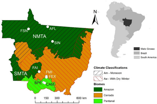 Location of flux towers in the evergreen ombrophilous forest (AFL), Amazon–Cerrado transition tropical forest (SIN), Brachiaria brizantha pasture (FSN) in the Amazon, Stricto Sensu Cerrado (FAI), mixed woodland–grassland (FMI), Brachiaria humidicola pasture (FEX) in the Cerrado, floodplain areas of Cambará monodominant forest (CAM) and shrubs (BPE) in the Pantanal and the Köppen’s climate classification [41] in the State of Mato Grosso, Brazil. The Amazon biome in this study was identified as North Mato Grosso Amazon (NMTA) and South Mato Grosso Amazon (SMTA).