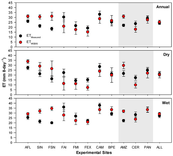 Annual and seasonal mean (±95% Confidence Interval) of measured (ETMeasured) and estimated (ETMODIS) 8-day evapotranspiration (mm 8-day−1) in each site in the Amazon (AMZ), Cerrado (CER) and Pantanal (PAN) sites and in all sites (ALL). The shading area refers to the mean ET in the three biomes of Mato Grosso.