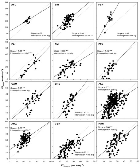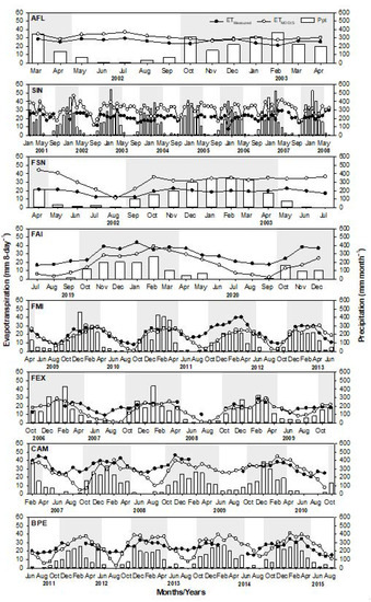 The combined ETMODIS dataset of all sites indicated that the MOD16 ET product was not significantly different from the measured ET during all analyzed periods; however, there were some notable spatial and temporal discrepancies between measured and MOD16 ET. This variable performance can be partly attributed to the different patterns of soil–plant–atmosphere interactions and the MOD16 ET model parametrization. Previous studies indicated that ET in the Cerrado sites (FAI, FMI, and FEX) was limited by soil water availability [4,44], while the ET in the evergreen ombrophilous forest (AFL) and the seasonally flooded forest (CAM) was limited by solar radiation availability [4]. The ET in the deciduous forest (SIN), the pasture (FSN), and the seasonally flooded shrubs (BPE) was limited by both factors—i.e., soil water and solar radiation availability [11,15,16,44,50,63].