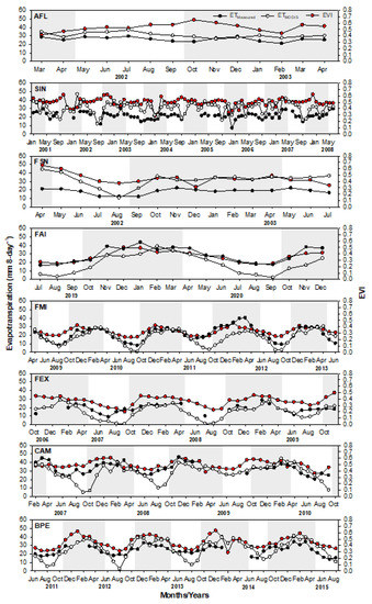 Monthly average of measured (ETMeasured) (black circles) and estimated (ETMODIS) (white circles) evapotranspiration of cumulative 8 days (mm 8-day−1), respectively, and 16-day average MODIS-based enhanced vegetation index (EVI) (red circles) in the experimental sites located in the Amazon (AFL, SIN and FSN), Cerrado (FAI, FMI and FEX), and Pantanal (CAM and BPE). The wet season over each site was highlighted with a gray vertical shaded background. A threshold of more than 100 mm of the monthly precipitation was used to identify the dry season, based on [62].