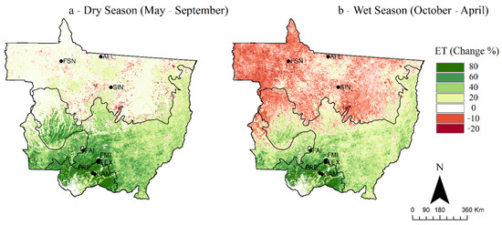 The identified spatial variability of ET based on the MOD16 product over Mato Grosso during the dry and wet seasons in this study showed some consistency with the regional climatology that was described in some previous studies (e.g., [4,44,49,80]) as well as the vegetation composition [81]. The spatial pattern of ET shown in Figure 6 was similar to that of precipitation, which had higher and lower values in the northern and southern parts of the state, respectively [82,83].